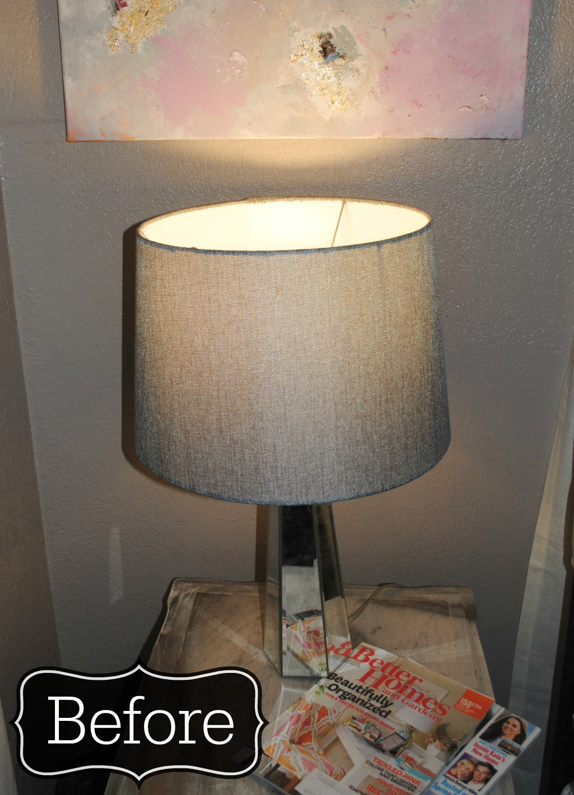 So…here we go. My very first blog post, and DIY tutorial. This is so exciting, isn’t it? Well let’s just dig right in. I am always looking for quick and easy ways to give rooms in my house a ‘fresh’ look. I like change and I get sick of seeing the same old thing. Poor Justin has had to paint our kitchen three different colors in the two years we’ve lived here. So, if you’re like me, and need to switch things up every once in a while but don’t feel like spending more time and money than you have to spare, just make small changes. Throw pillows, rugs, LAMPSHADES. They can give a room a whole new feel… Which brings me to this DIY…Metallic Lined Lampshade.